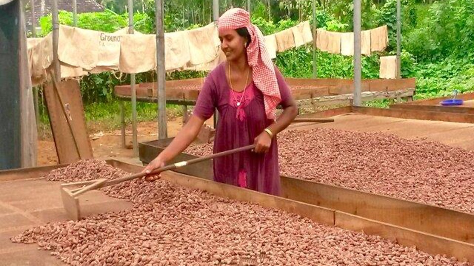 In Southern India, the green hills of the Idukki region, famous for its fragrant spices, offer excellent conditions for growing cacao. Abundance in rainfall and sunshine result in cacao beans with a chocolaty aroma, smooth and creamy texture, and rich flavour diversity of spices, raisins and tobacco.